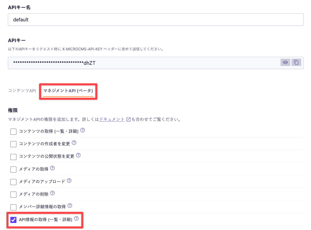 マネジメントAPIのデフォルト権限で「API情報の取得」を有効にして、リクエストヘッダーに含めて送信してください。