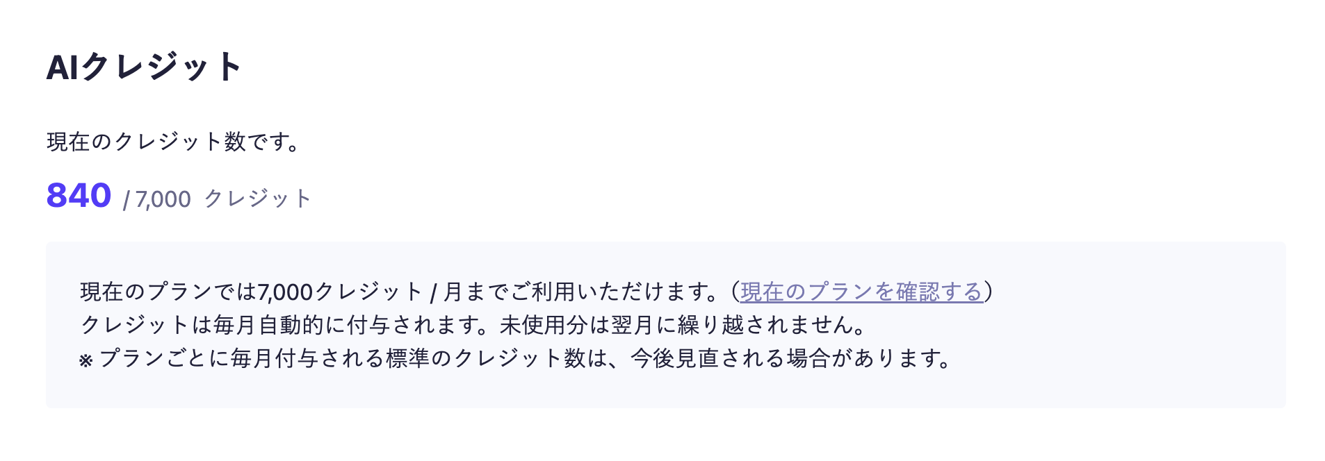 - クレジットの超過について: 利用されるクレジット数はAIによる処理が完了するまで予測が不可能です。そのため、残量が上限間際で実行した場合、上限を超過して消費されるケースがあります(エラーにはならず超過数値がそのまま表示されます)。