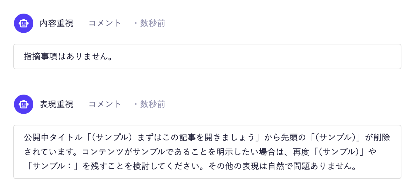 コンテンツを修正した後は、AIレビュアーの横にあるアイコンから再レビューを依頼することができます。再レビュー時は、過去のレビューコメントややりとりのコンテキスト(文脈)は引き継がれません。常に、その時点の最新のコンテンツ内容に対して新規のレビューとして実行され、新たなコメントが追加されます。