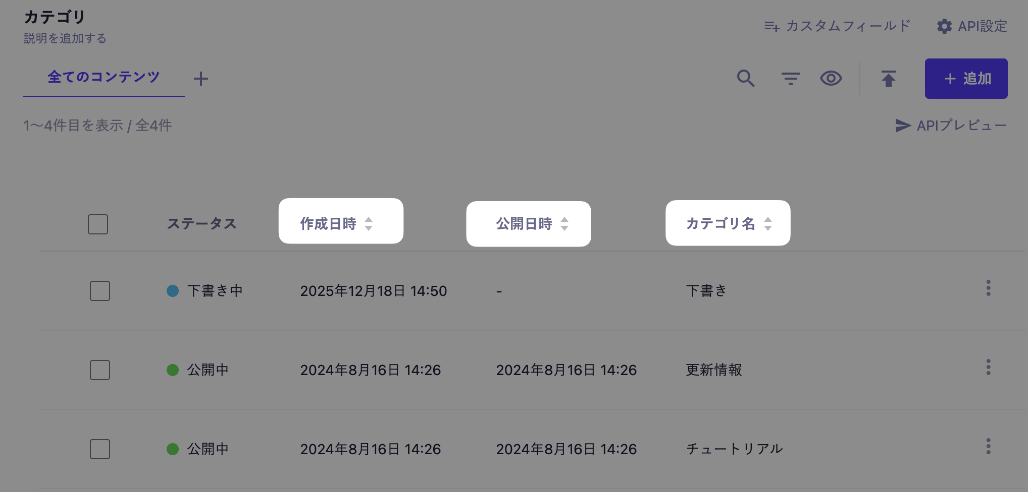 また、コンテンツ一覧画面での並び順は、GET APIのレスポンスの並び順にも影響します(ordersパラメータの指定がなく、デフォルトの場合)。