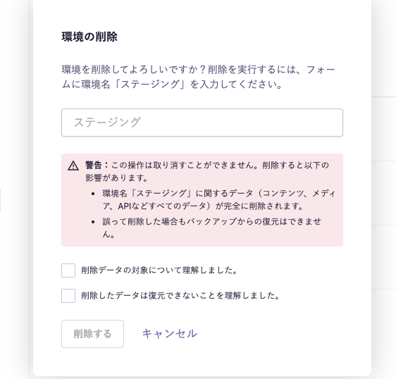 環境を削除すると、当該環境に関するデータ(コンテンツ、メディア、APIなどすべてのデータ)が完全に削除されます。誤って削除した場合もバックアップからの復元はできません。