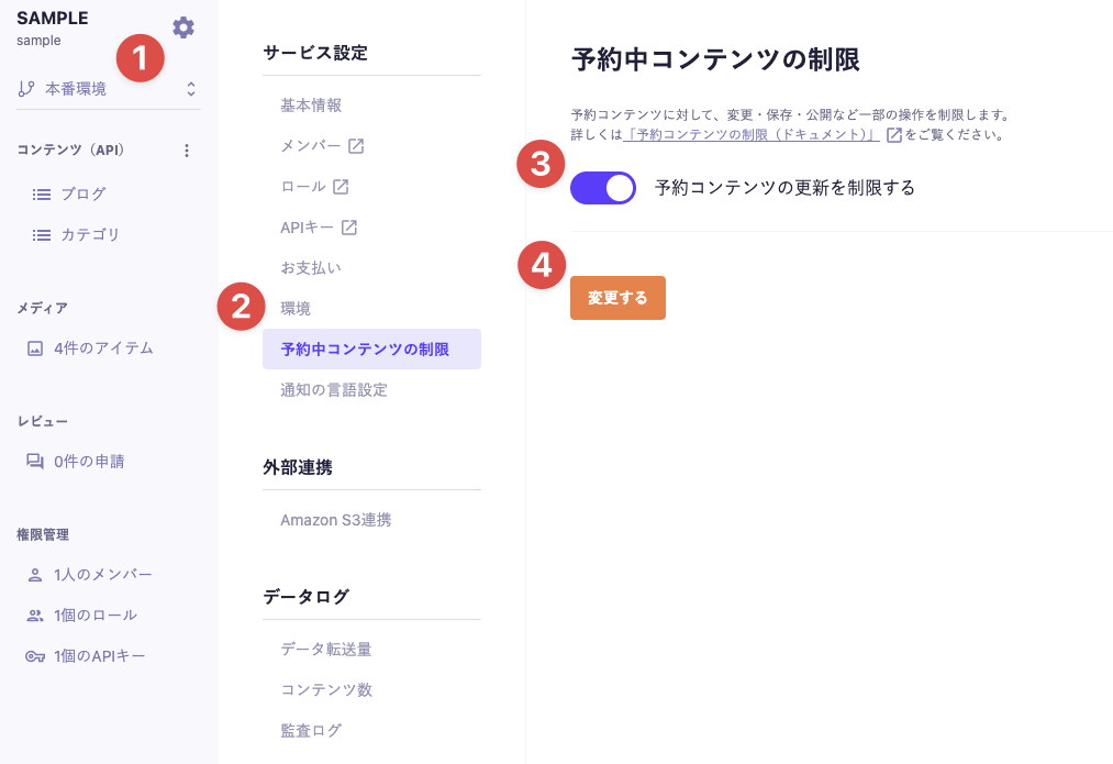 - 3. 「予約コンテンツの更新を制限する」をONにする